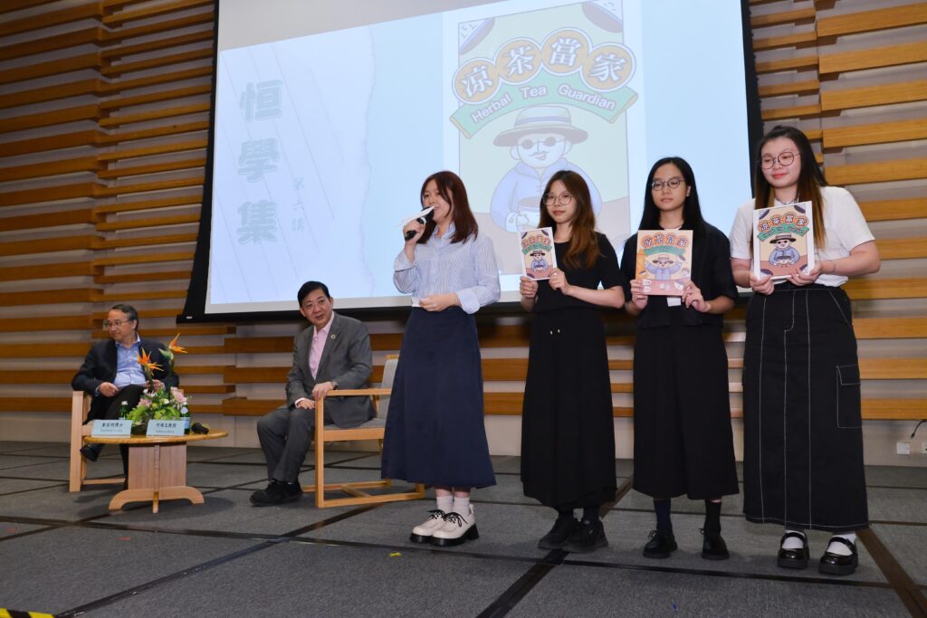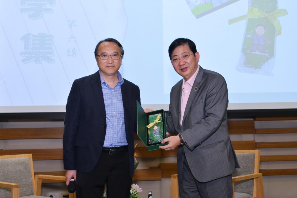 As a token of appreciation, Dr Ben Cheng, Director of the Centre, presented two special gift sets to President Ho. The first was a unique silk tie gift set in green, featuring a caricature of President Ho, wrapped in a gift box showcasing the HSUHK campus, designed by Mr Michael Fung, an alumnus of the Department of Art and Design. The second gift was an Herbal Tea Guardian Game, created by a group of Year 4 students from the BA-CCI Programme in the Department of Art and Design.