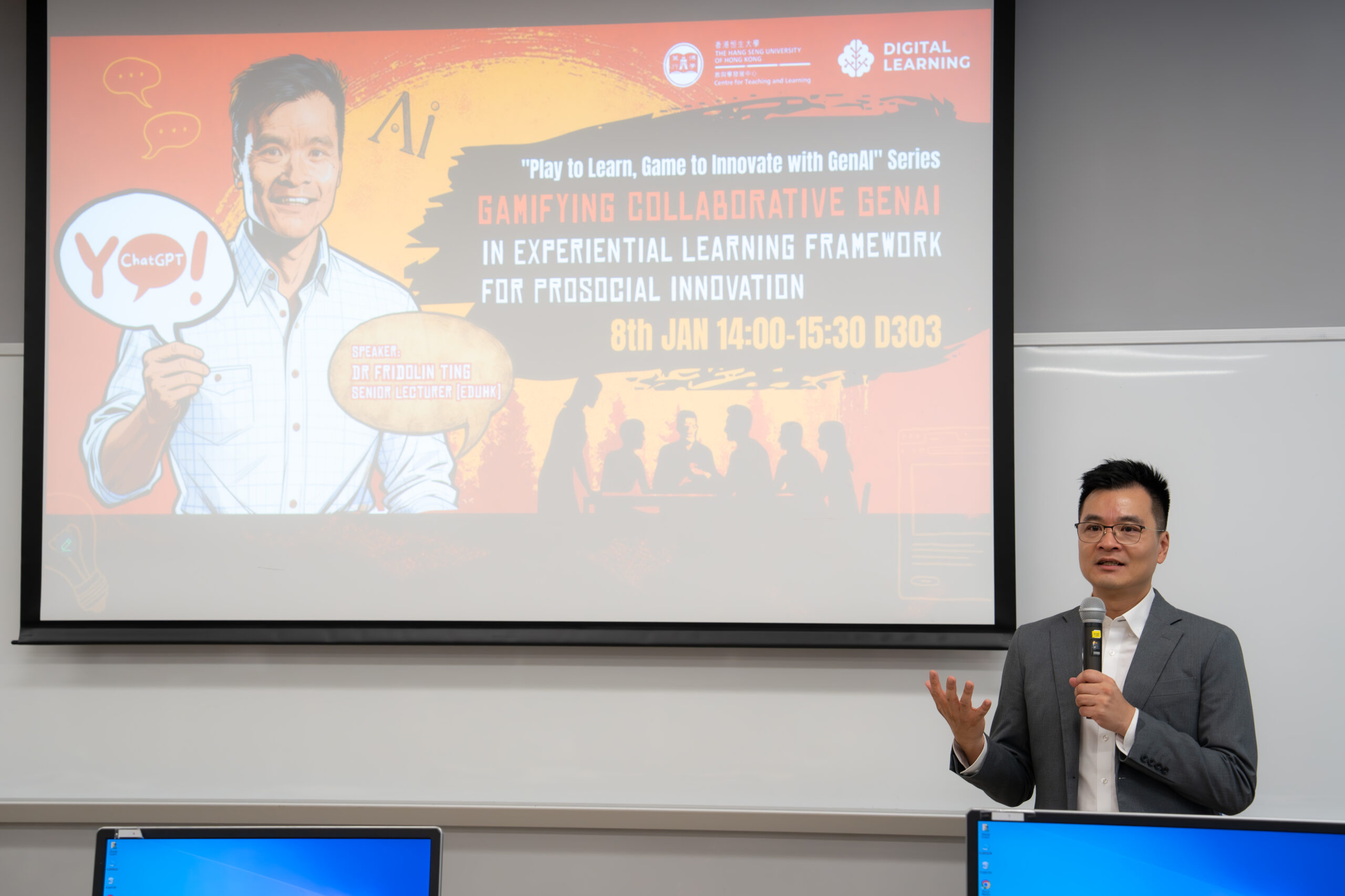The Centre for Teaching and Learning (Digital Learning Section) hosted the last session of the “Play to Learn, Game to Innovate with GenAI” workshop series, “Gamifying Collaborative GenAI in Experiential Learning Framework for Prosocial Innovation,” led by Dr Fridolin Ting from the Department of Mathematics and Information Technology, The Education University of Hong Kong on 8 Jan 2026.