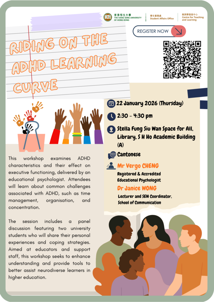 Through this workshop you will engage yourselves in some interactive discussions followed by case studies from university students together with Dr Janice Wong (Lecturer, School of Communication & SENCO) and Mr Vergo Cheng (Registered & Accredited Educational Psychologist).